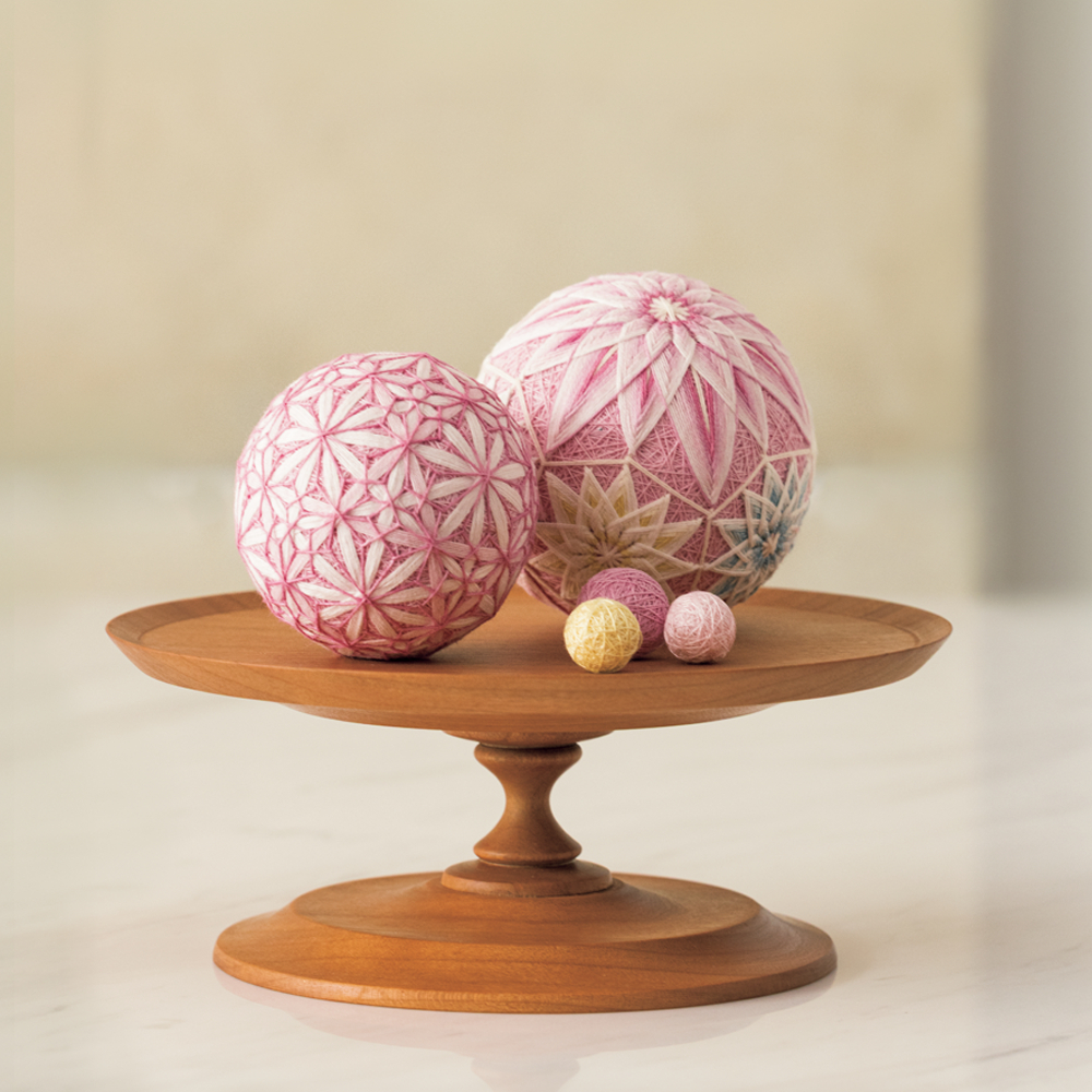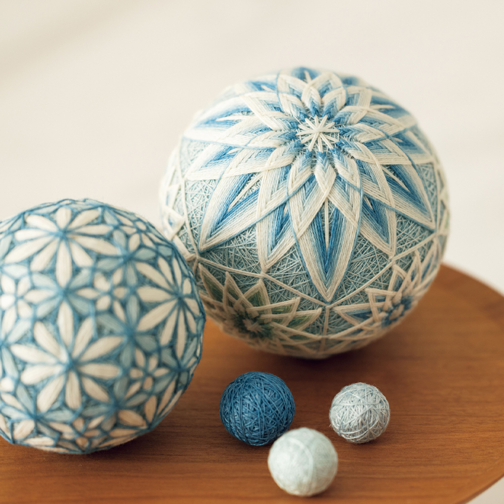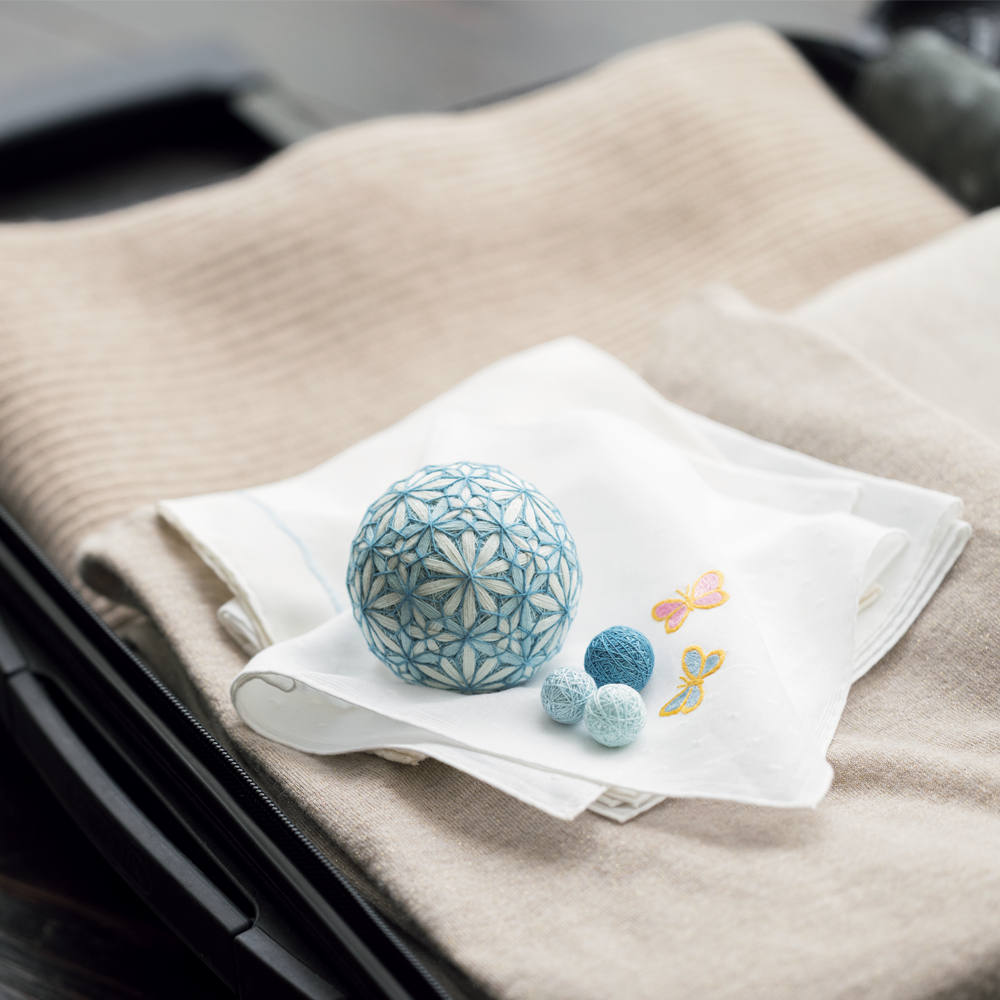 左側の手まりには、七宝文様の上に麻の葉文様を重ねた文様を、右側の手まりには来福や健康への祈りを込めて花車文様をかがっています。どの手まりにも天然の香りを忍ばせています。