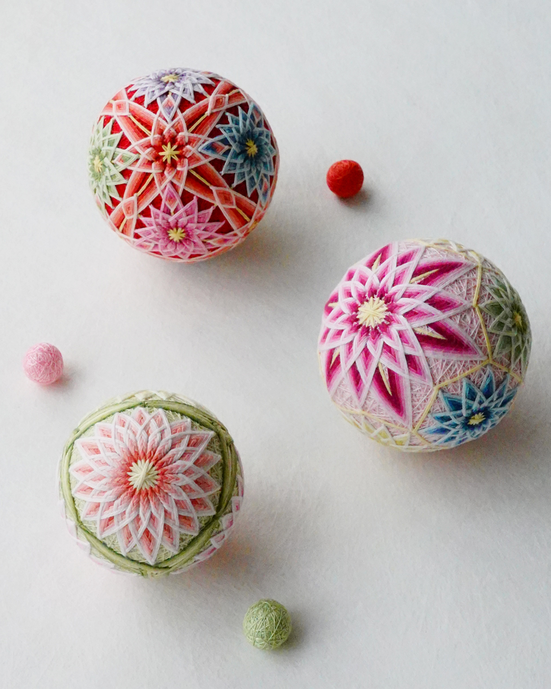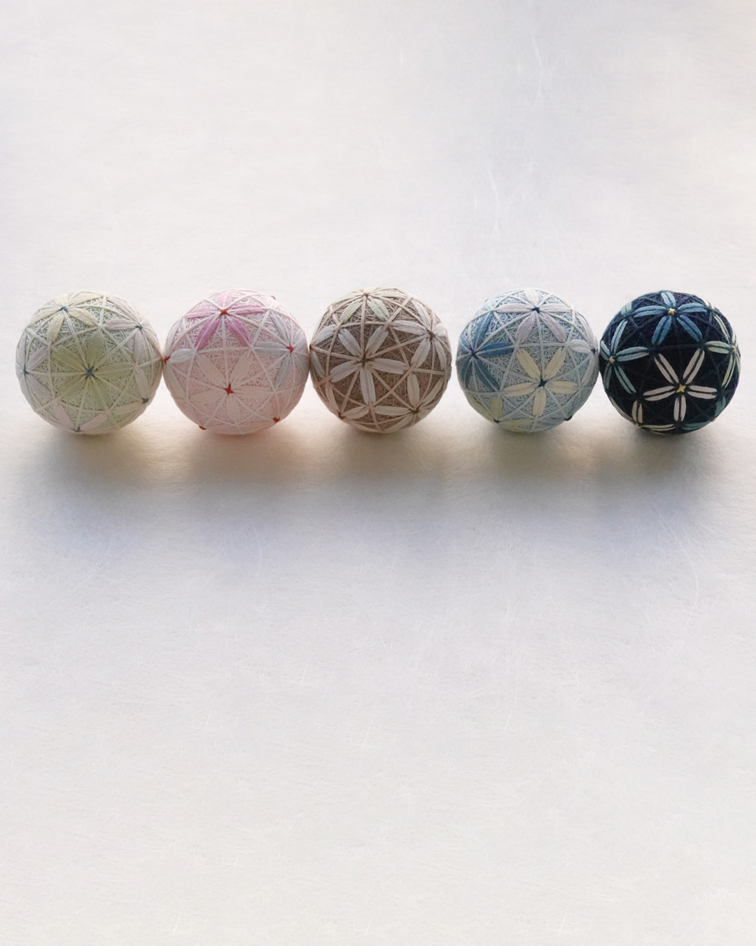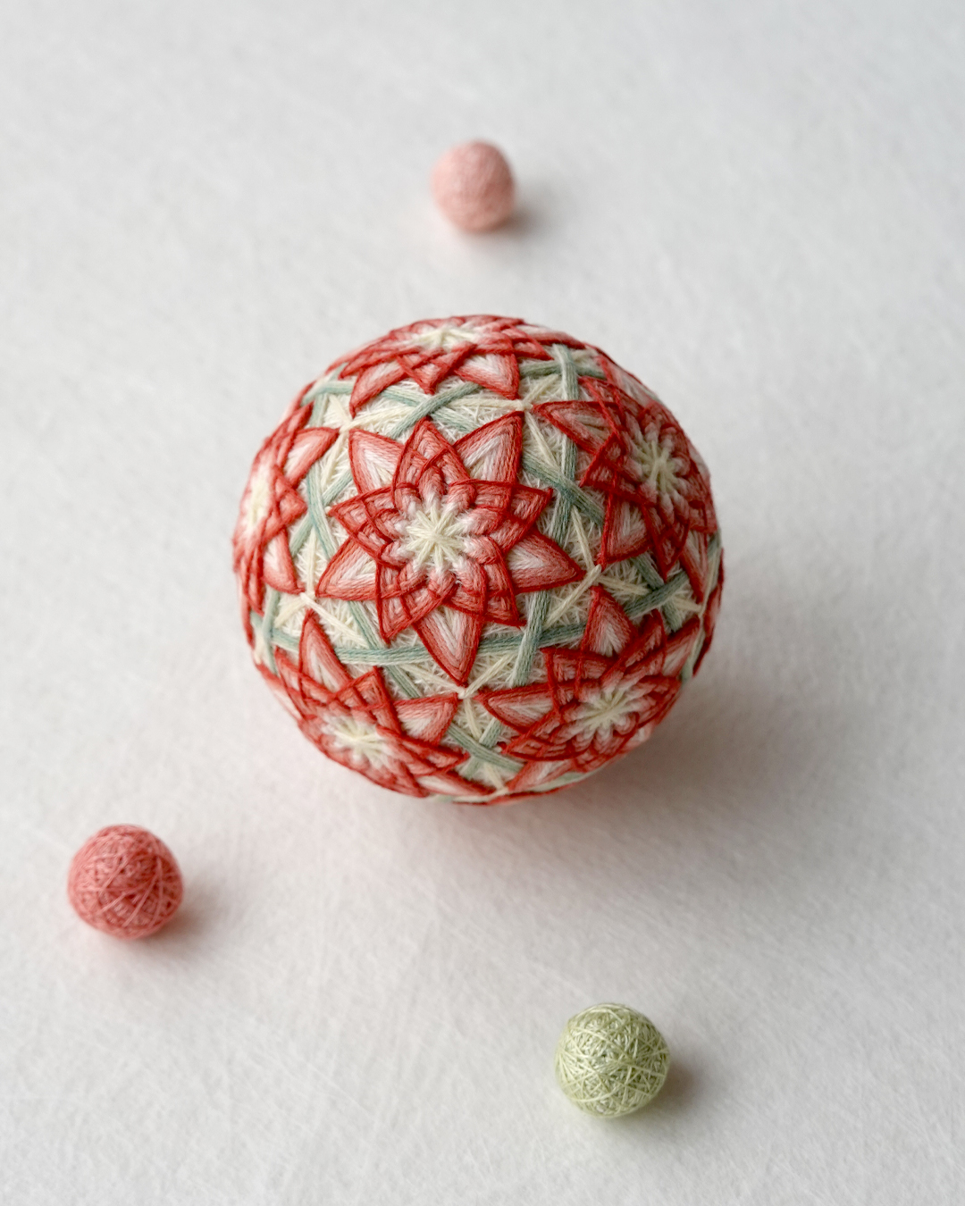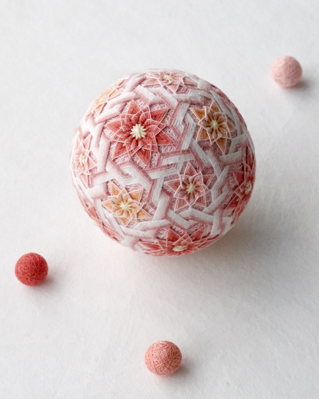 初心者の方にも、経験者の方にも楽しんでかがっていただける模様です。土台のまりとかがり糸は、当日お好きなものをお選びいただけます。(作品サイズ/直径約 5.7cm、円周 18cm)
